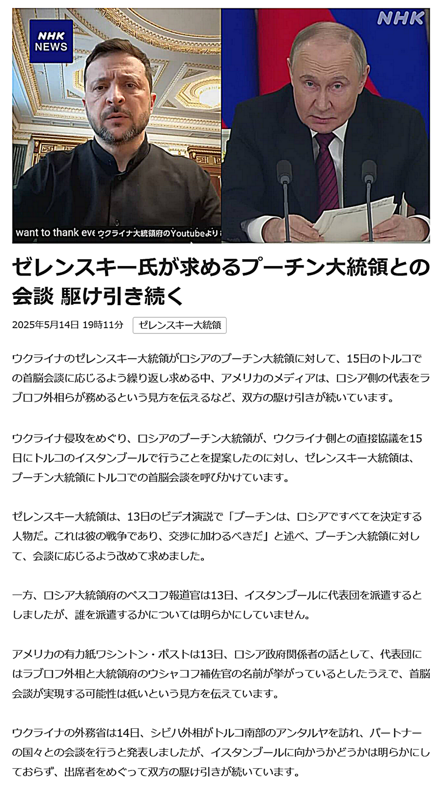 領土について厳しい判断を迫られた場合、国民投票を実施する考えを表明した。その上で、投票実施のため、少なくとも60日間の停戦期間が必要だと強調。