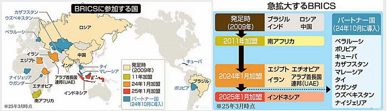 人口2億8000万人は世界4位(24年)、経済規模は世界16位(23年)のインドネシアを加えたことで、BRICS加盟10カ国の合計は世界人口の48%、世界GDP(国内総生産)の4分の1以上を占めることになった。
