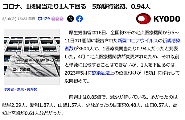 1人を下回るのは、2023年5月に感染症法上の位置付けが「5類」に移行して以降初めて。・・・・でも、だからと言って手放しで喜んでイイのでしょうか?