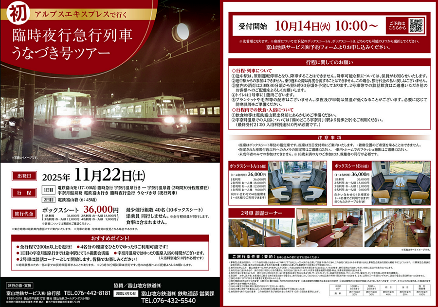 旅は午後5時に富山駅を出発し上市、魚津などを巡ったあと、宇奈月温泉駅に停車し、翌朝に富山駅に戻るルート。