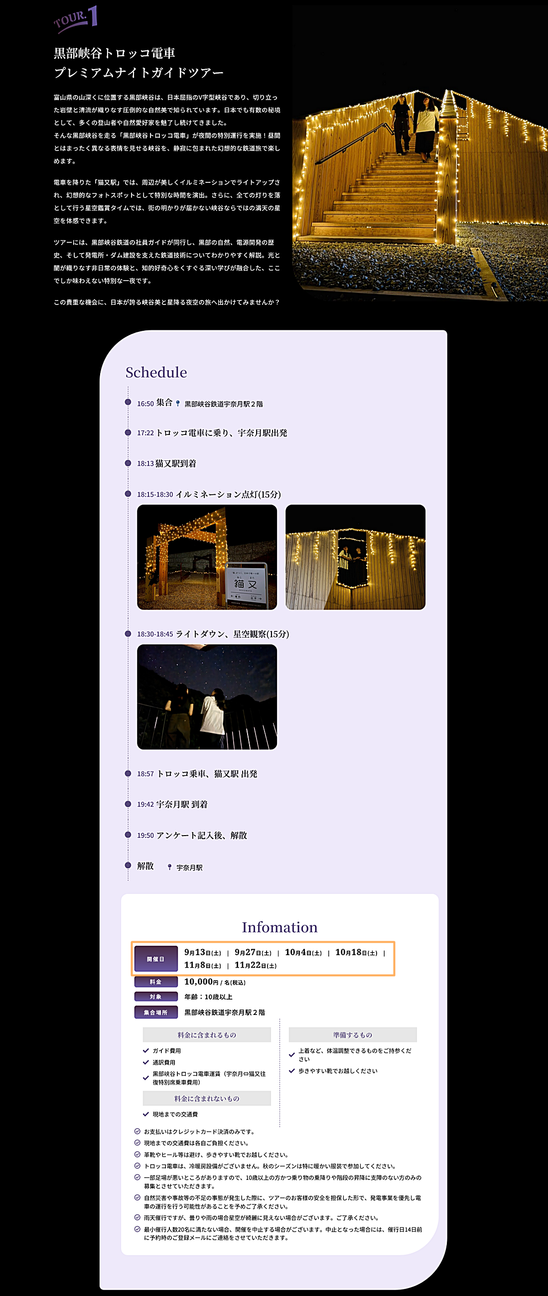 私が特にご紹介させて頂きましたナイトガイドツアーですが、普段のトロッコ列車の運行時刻は下記の通りになっておりまして。