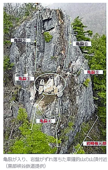 東鐘釣山を貫くトンネルを出た所に掛かる鐘釣橋の損傷となった原因ですが、以前から同山腹に発生していた浮石(岩)を毎シーズン前に(専門家の方々が)山頂から命綱で問題個所まで降りて来られ、崩落が予想される石を除去されていた事を伺いました。直接の原因は地震ですが、幸いな事に走行中のトロッコ列車が直撃を受けることが無かったのが何よりではと。