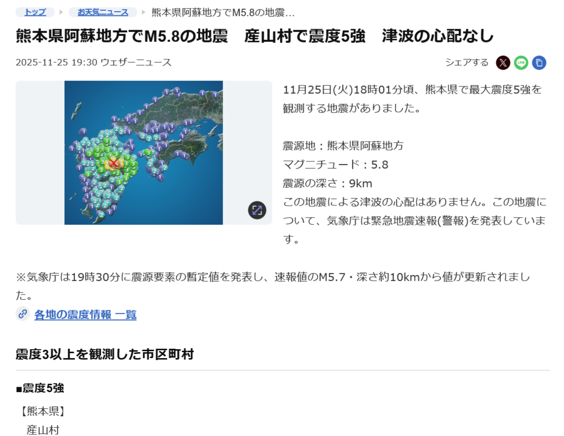 今夜、熊本県産山村でM5.8の地震が発生しました。(その後、余震が続いています)