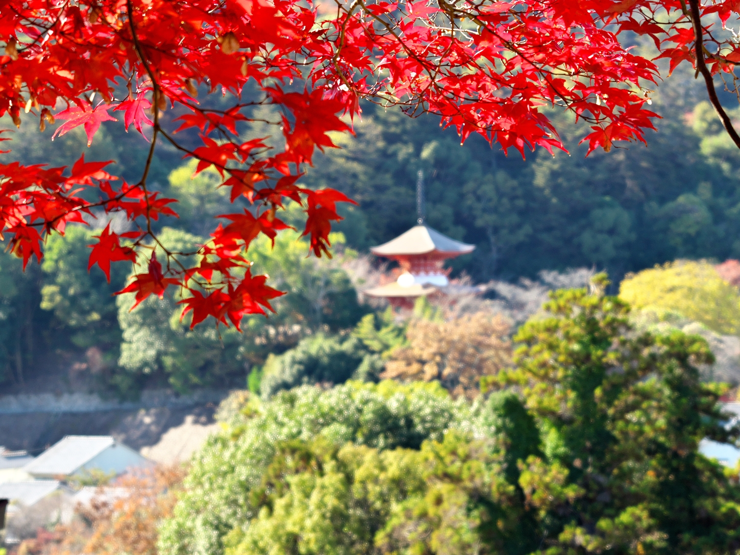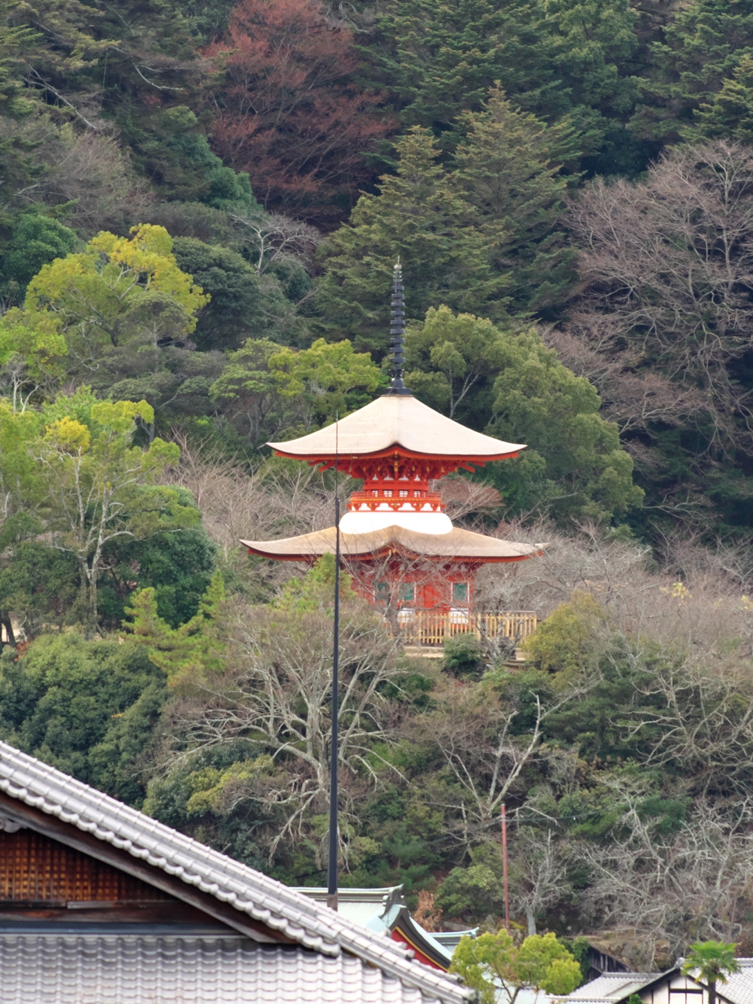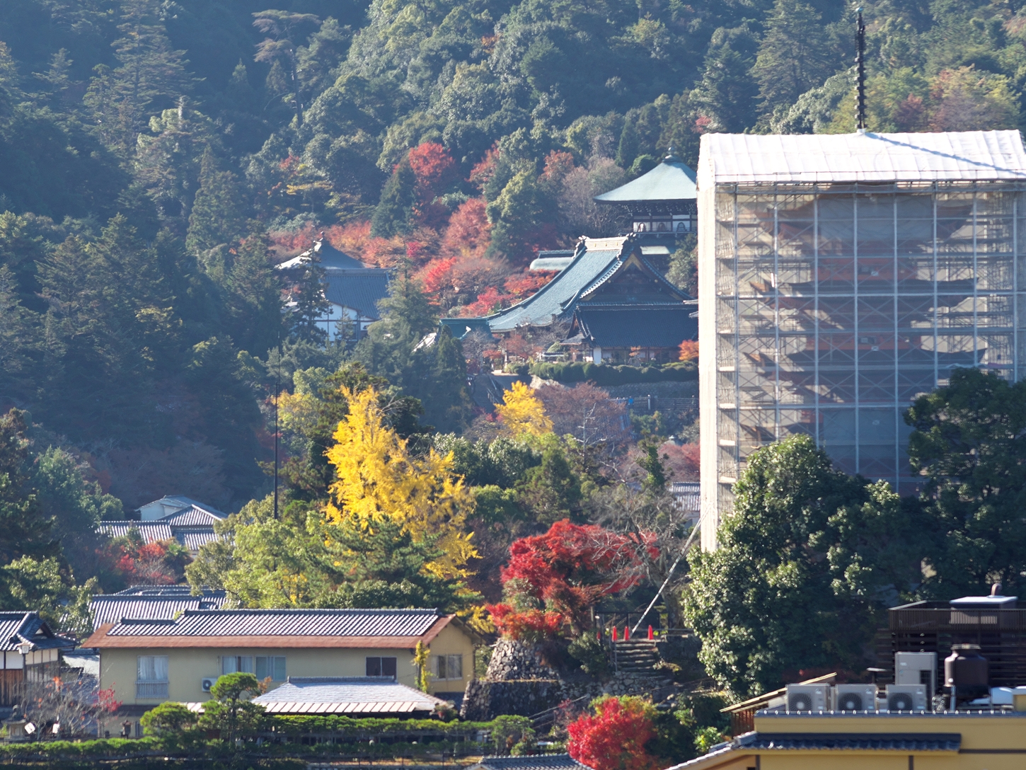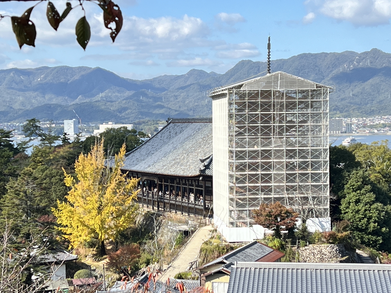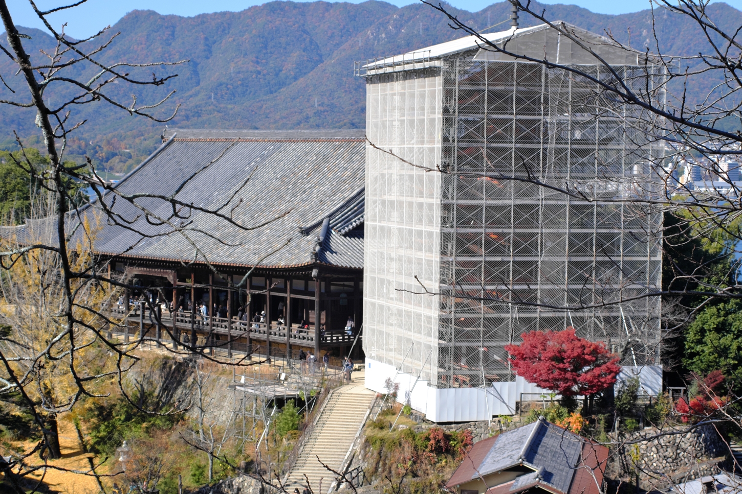 | これこそ今シーズン最後の紅葉でしょうかね・・・・ | 大好きな場所ですが、右手背後には多宝塔周囲に足場が組まれて大修理中です | 遠くに広島市西区井口台の団地の姿が | |||