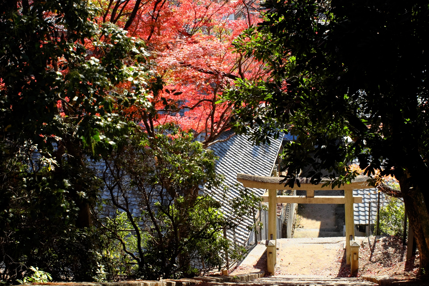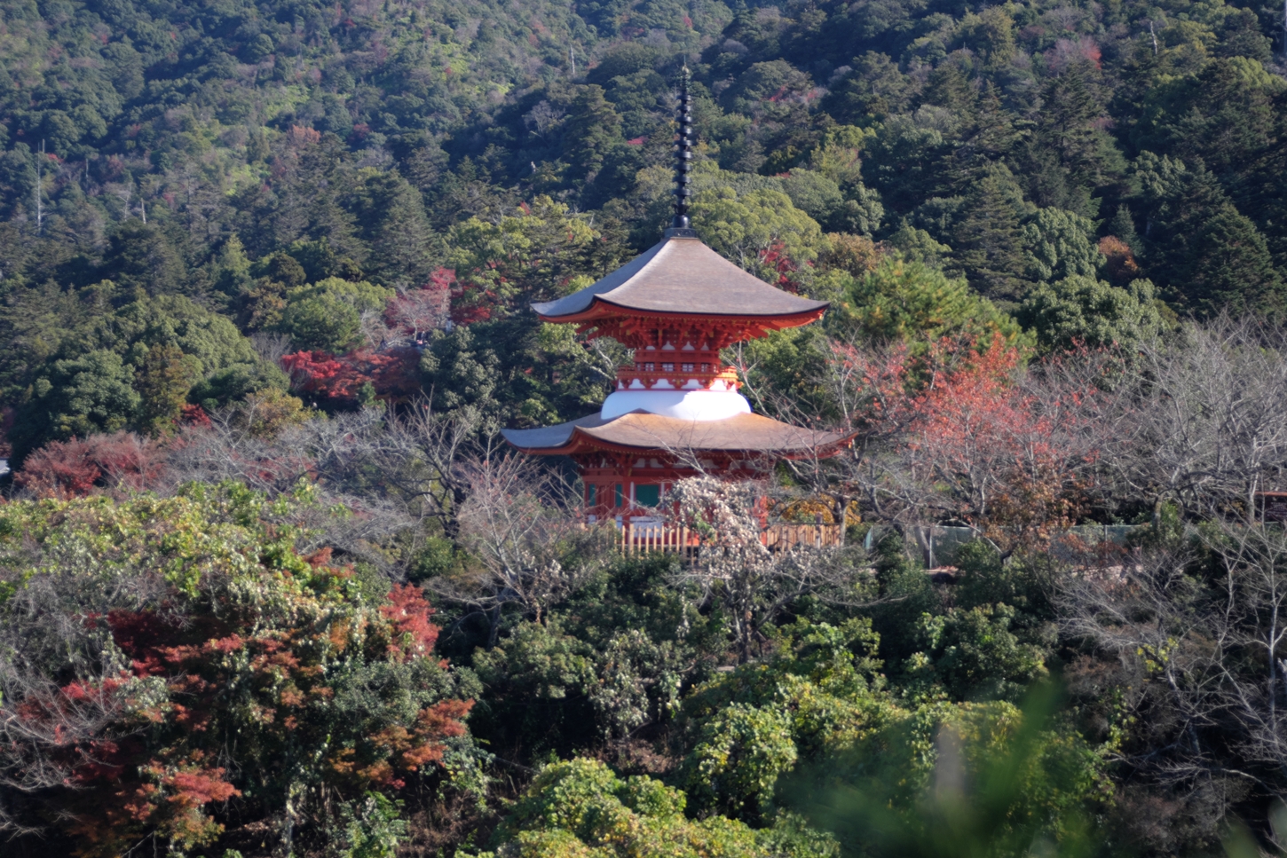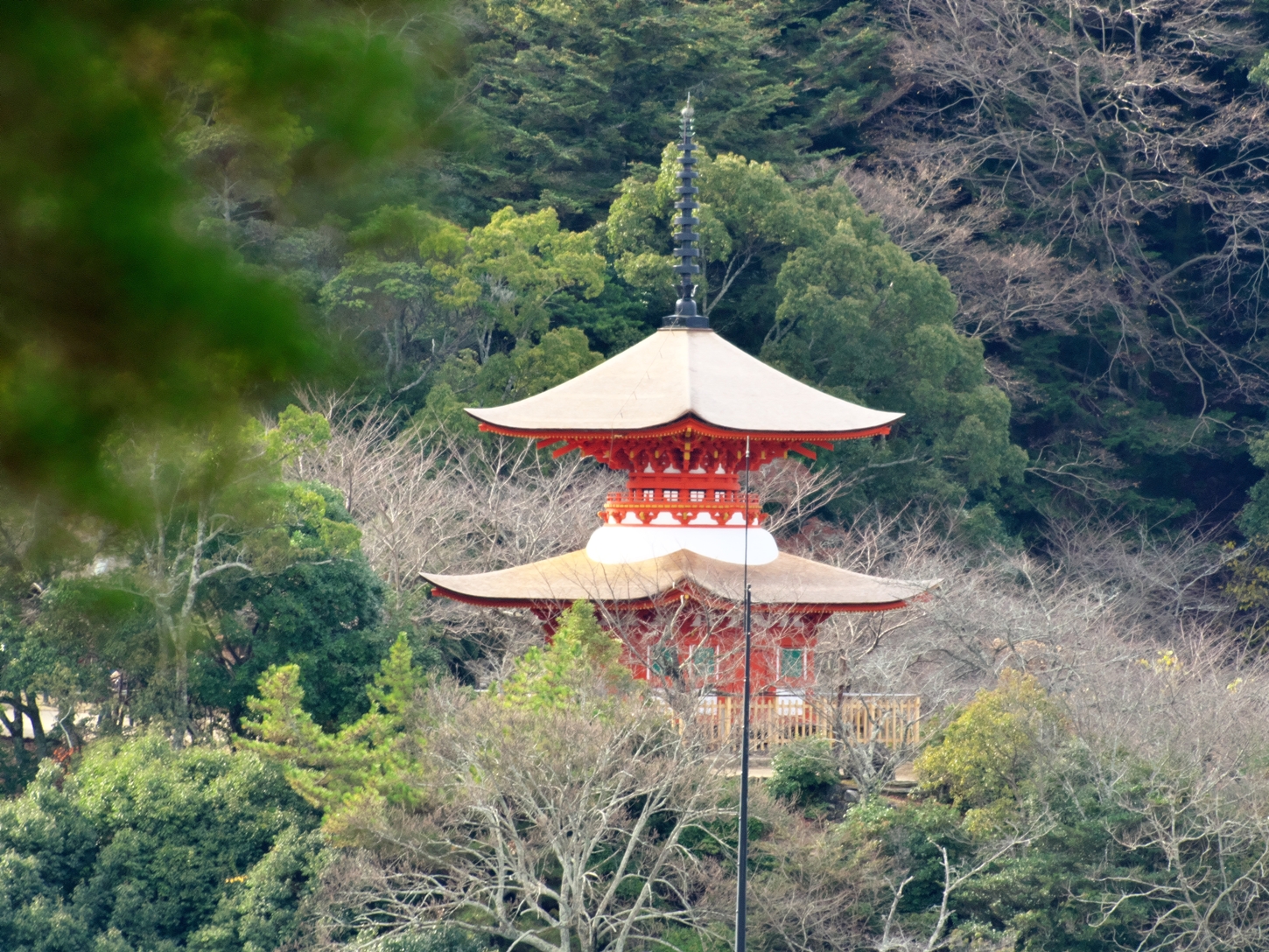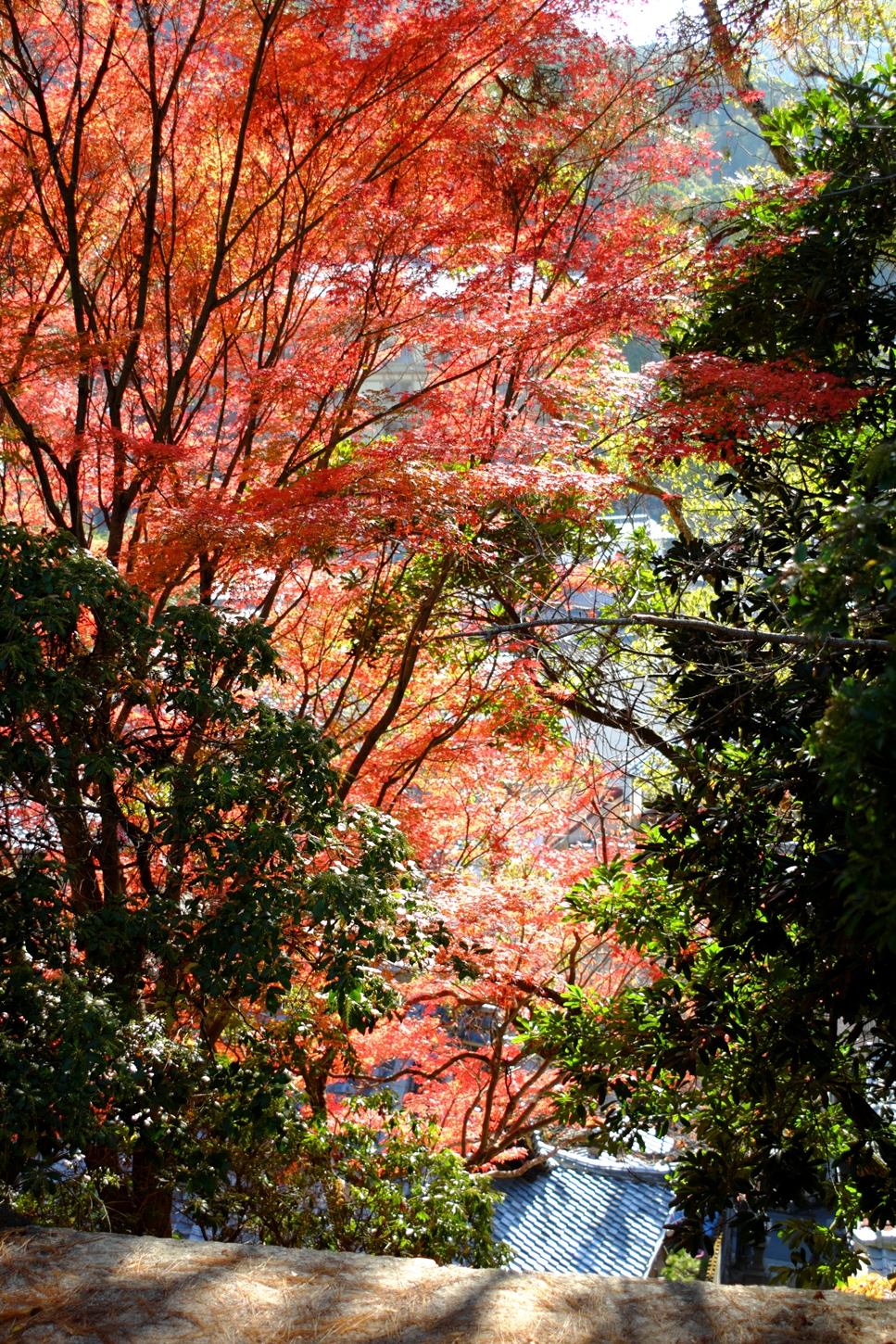 | これこそ今シーズン最後の紅葉でしょうかね・・・・ | 大好きな場所ですが、右手背後には多宝塔周囲に足場が組まれて大修理中です | 遠くに広島市西区井口台の団地の姿が | |||