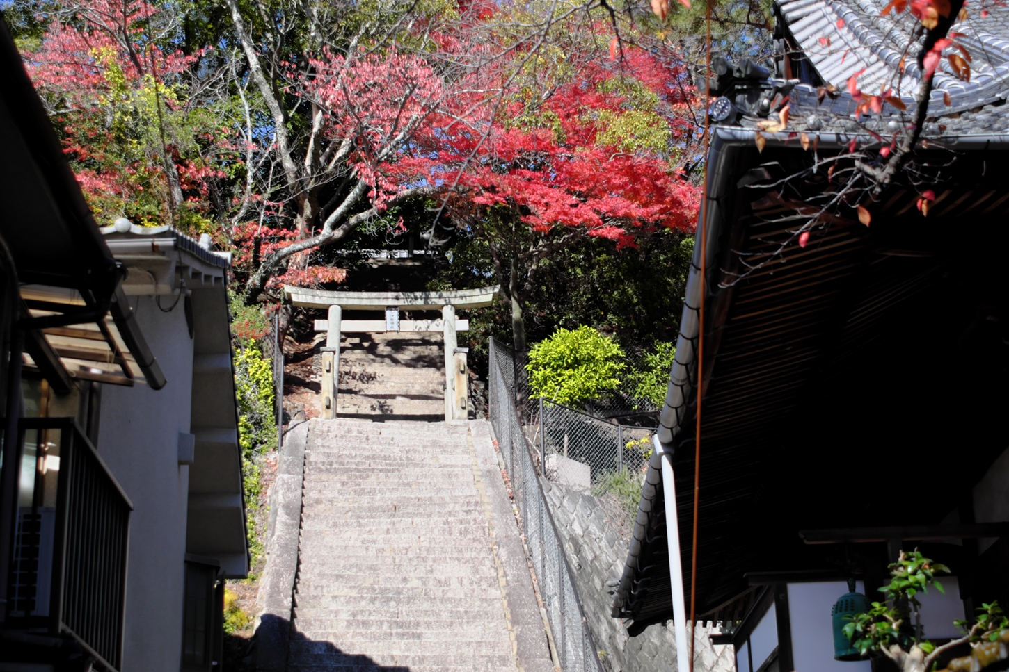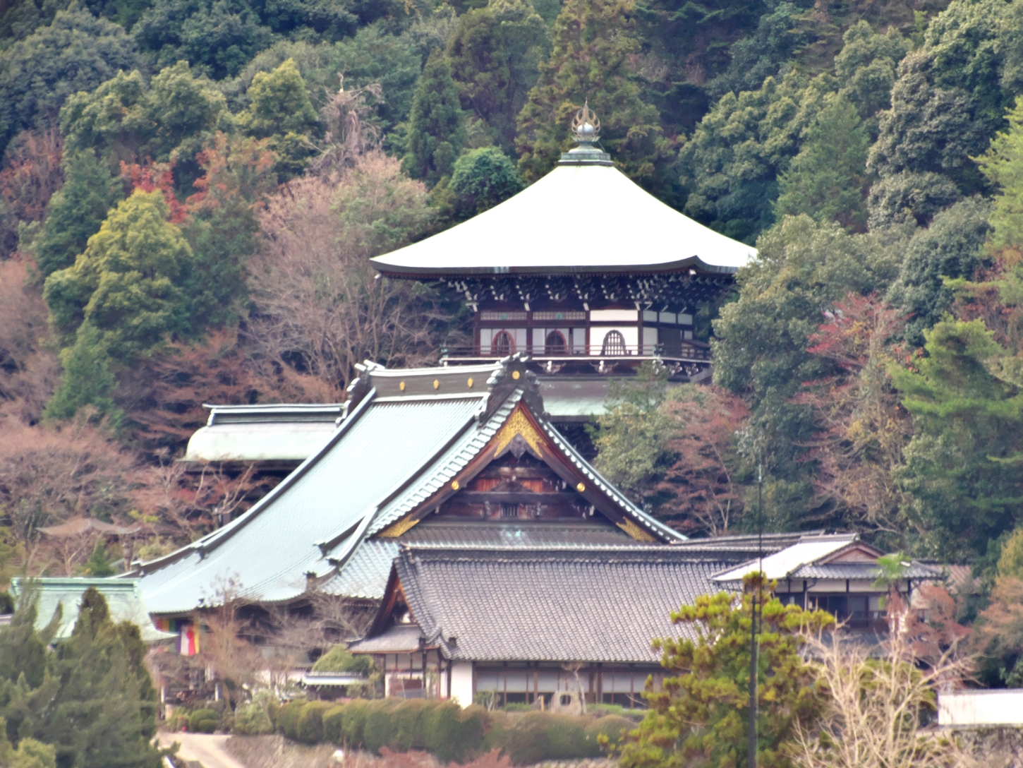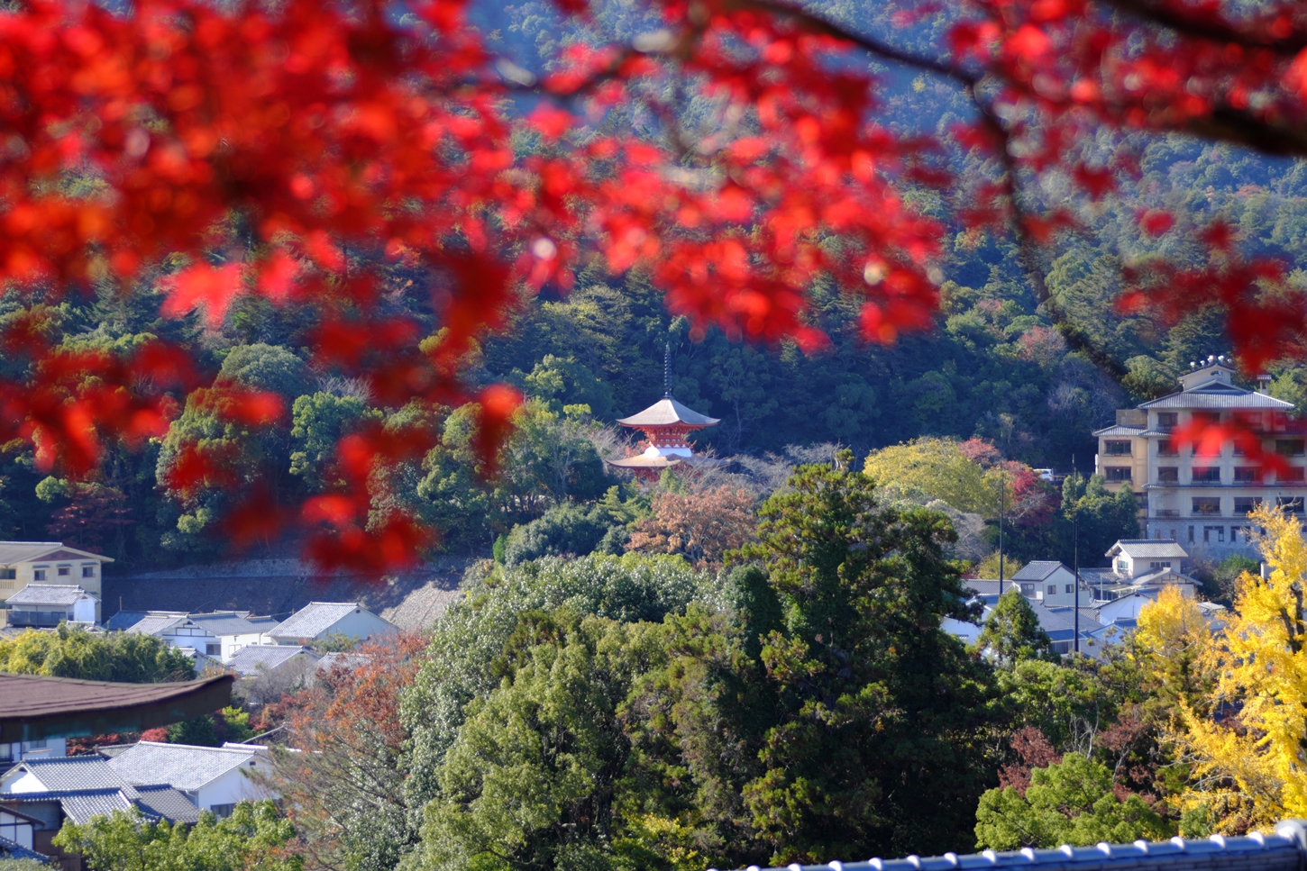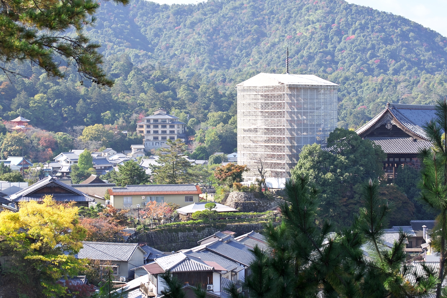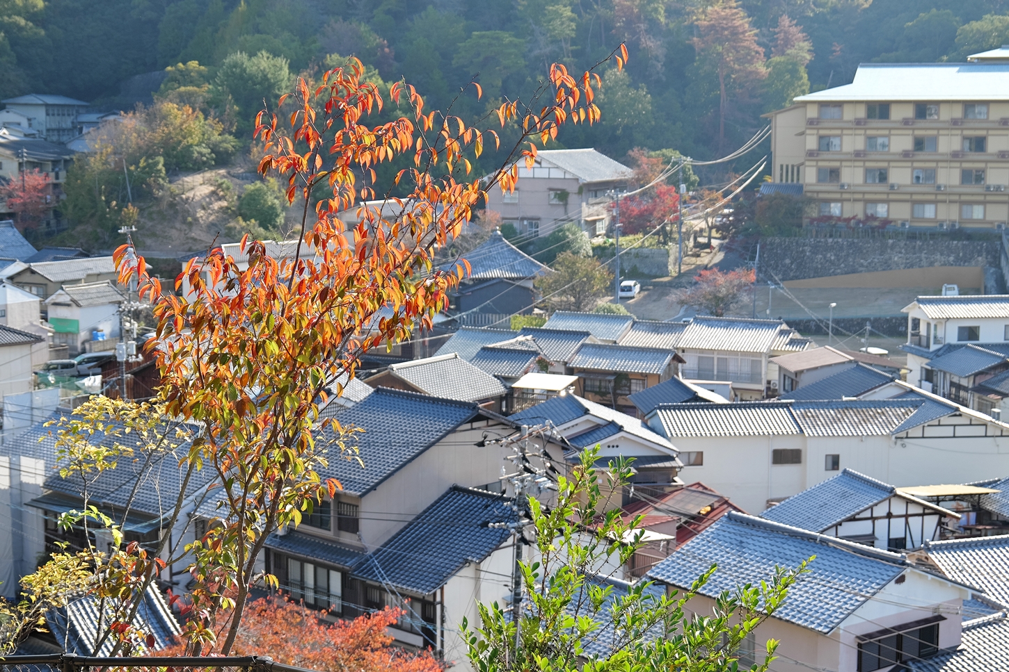 | これこそ今シーズン最後の紅葉でしょうかね・・・・ | 大好きな場所ですが、右手背後には多宝塔周囲に足場が組まれて大修理中です | 遠くに広島市西区井口台の団地の姿が | |||