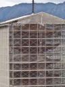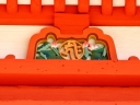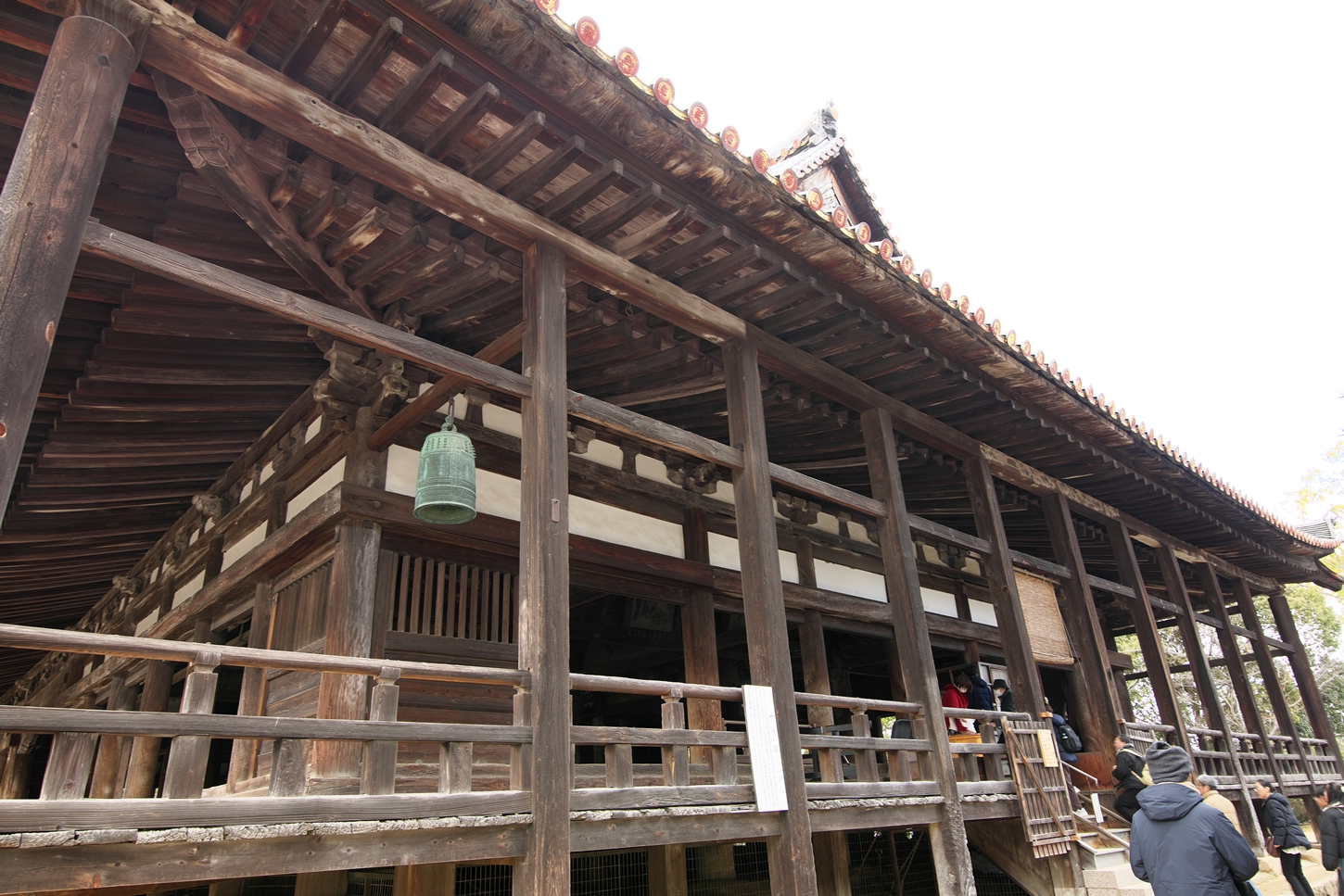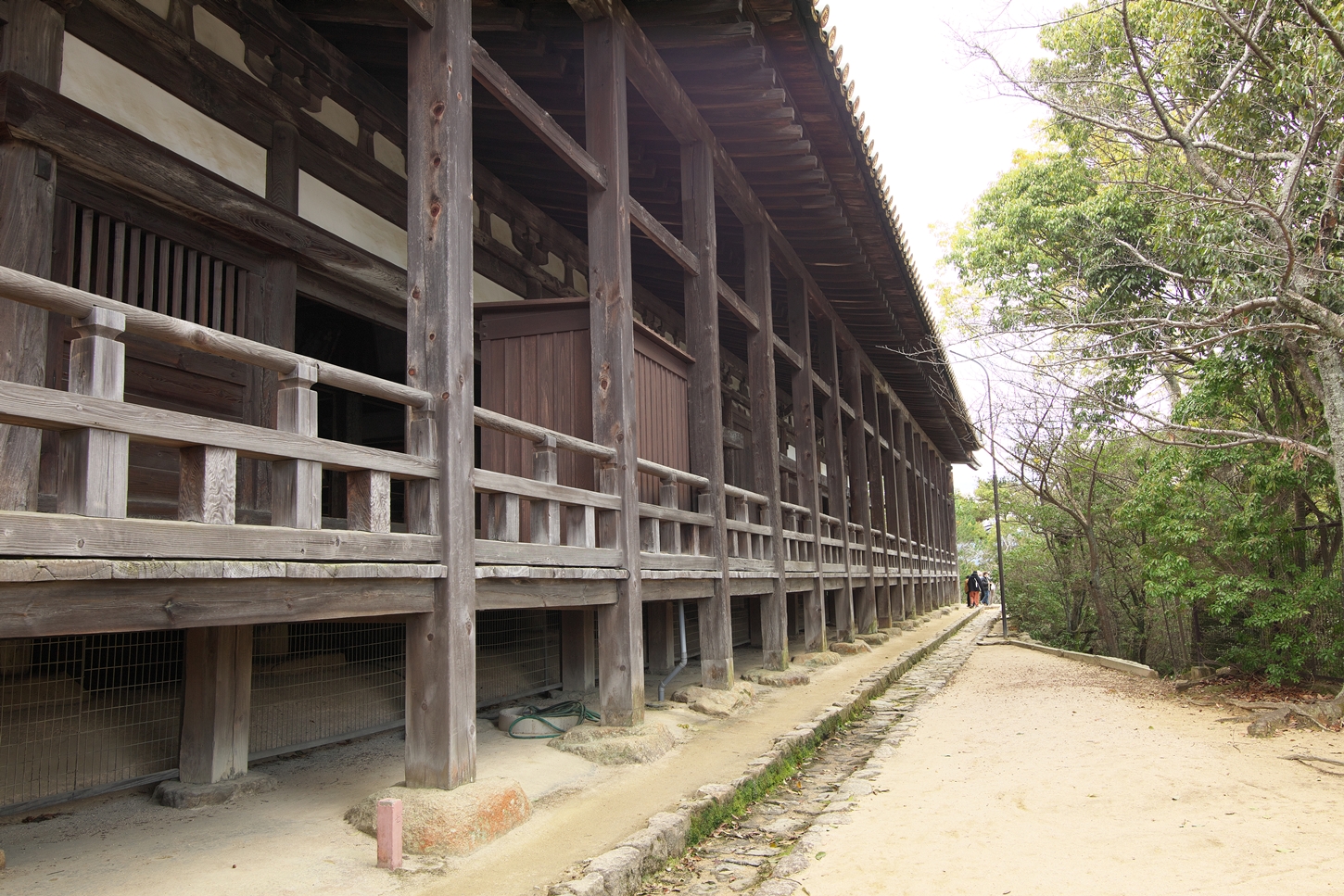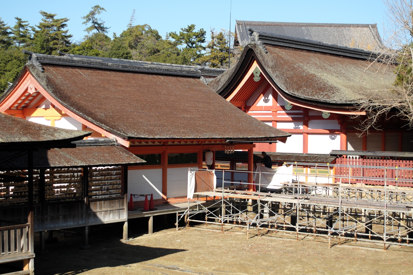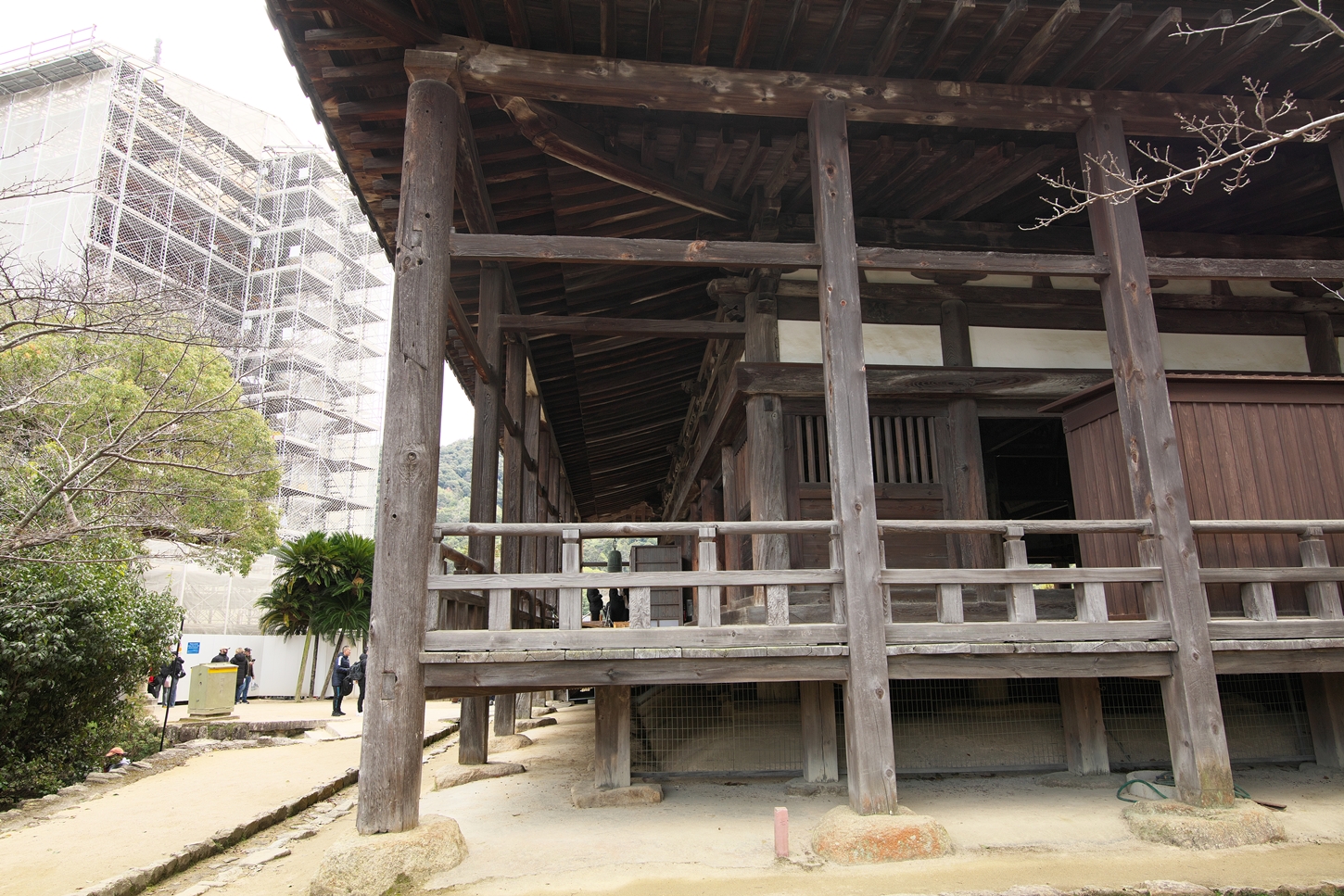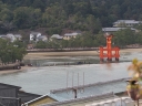 | 右楽房下部の足場です | 大鳥居をバックにしての一番人気の撮影スポットで順番待ちの列が! | 西廻廊、能舞台・能楽屋ですが、この方向からは干潮の時だけに眺められますね | 大願寺に移動しました | ||