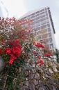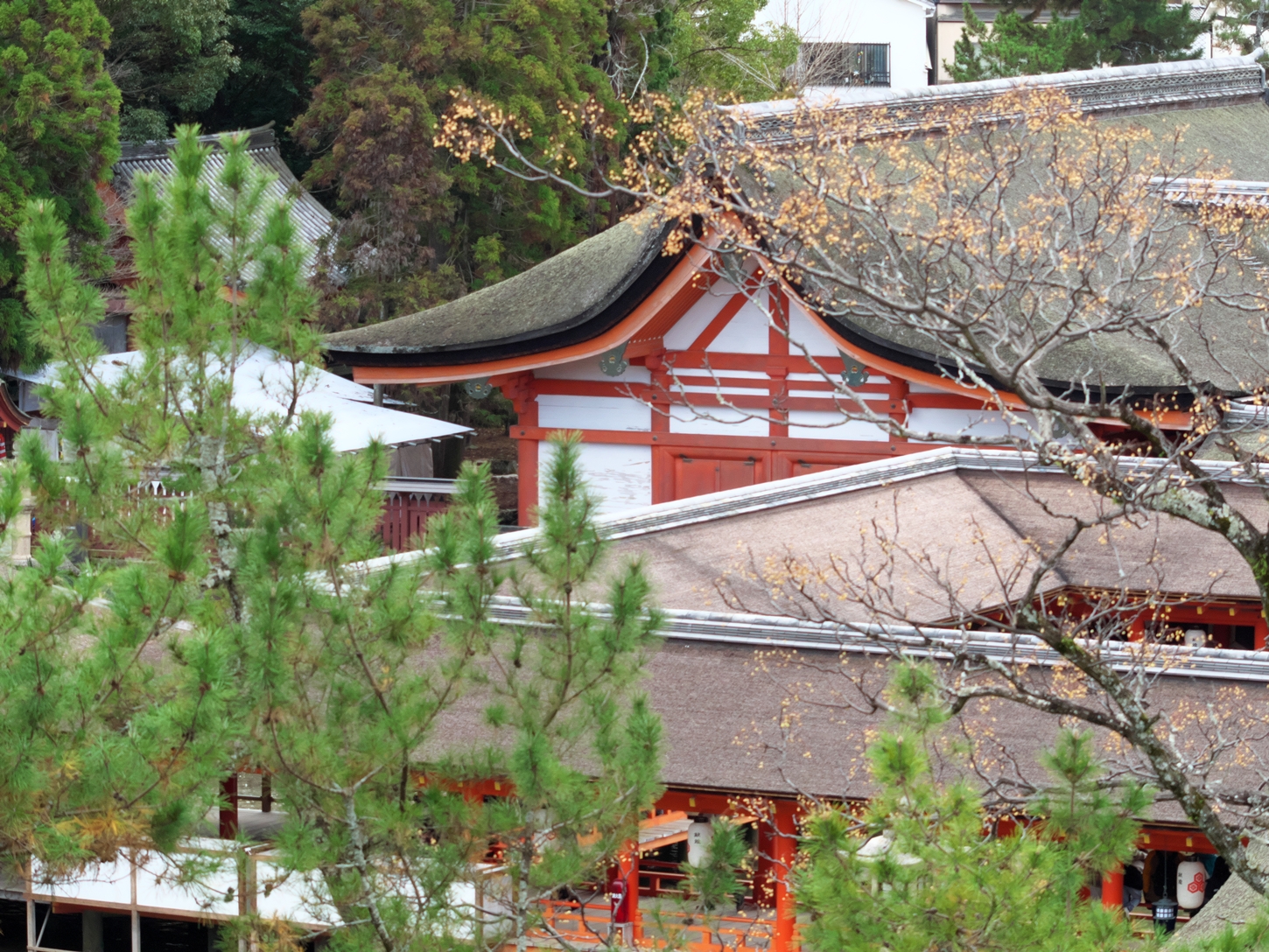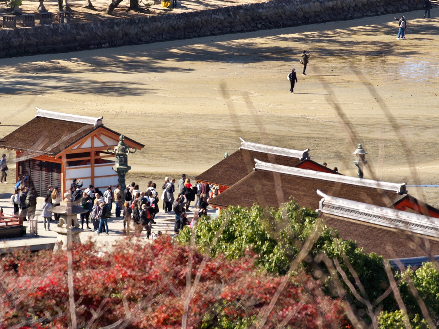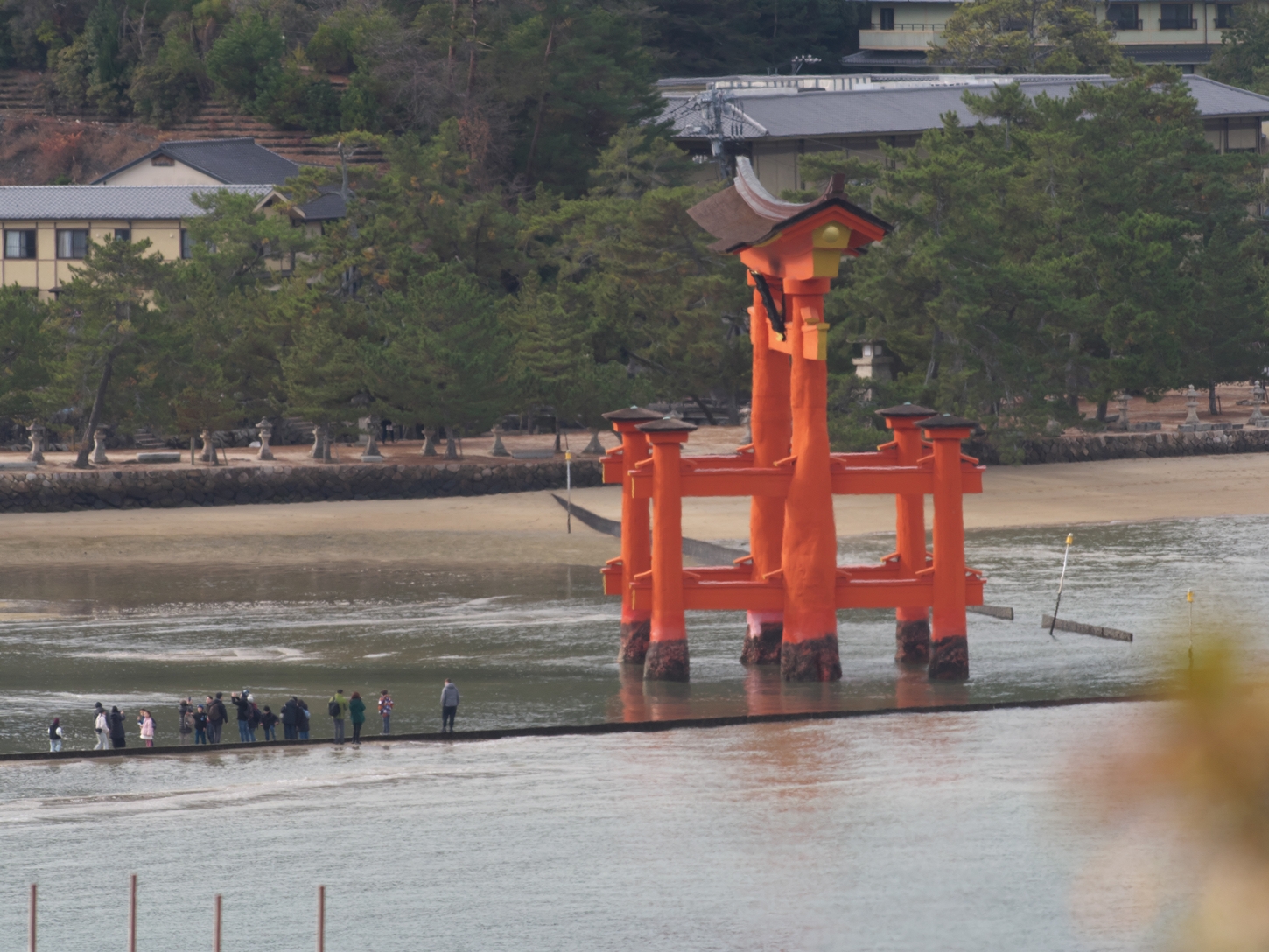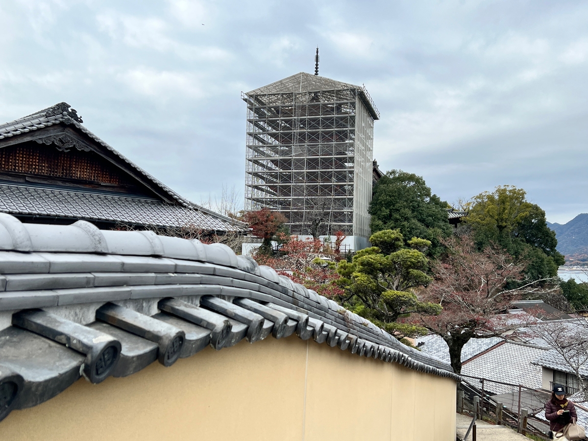 今朝9:30が干潮でして、その1時間後の今。鳥居右側の砂浜はどんどん海水の下に | 唯一、この方向で紅葉が残っているようです | 宮島交流館・裏に出る三差路脇のアセビの群生。日当たりが良くて元気イッパイ! | 無理矢理、多宝塔を写し込んでみました💦 | 下手くそ画像m(__)m | 千畳閣左脇の大銀杏も 落葉が大部分になりました | 足場と養生シート越しの五重塔・・・早く修復工事が終わって欲しいです |