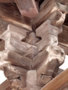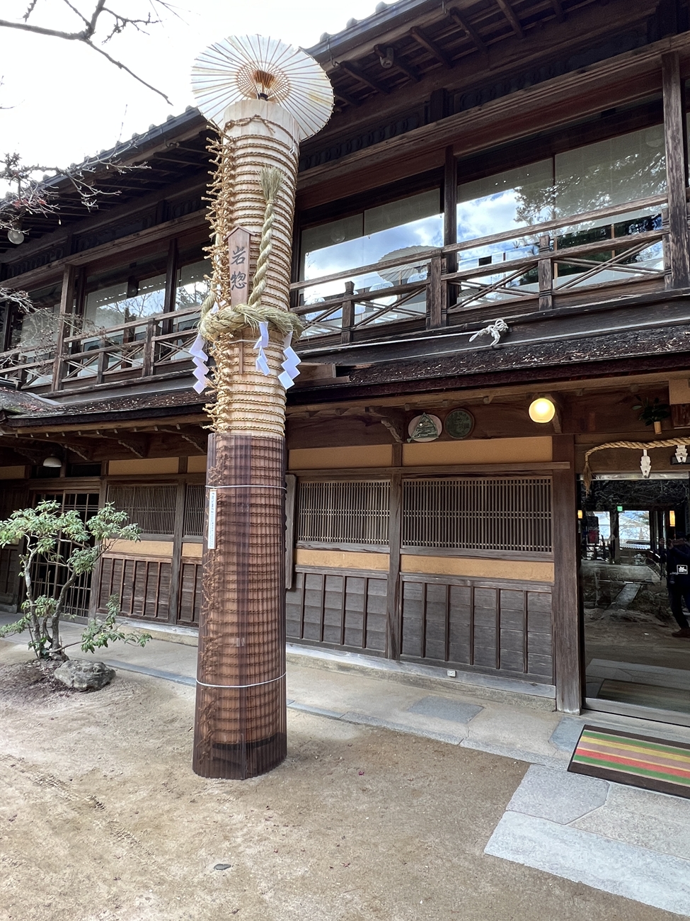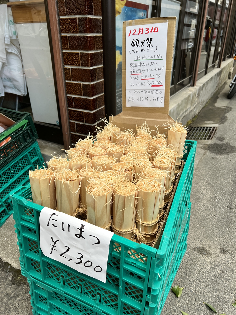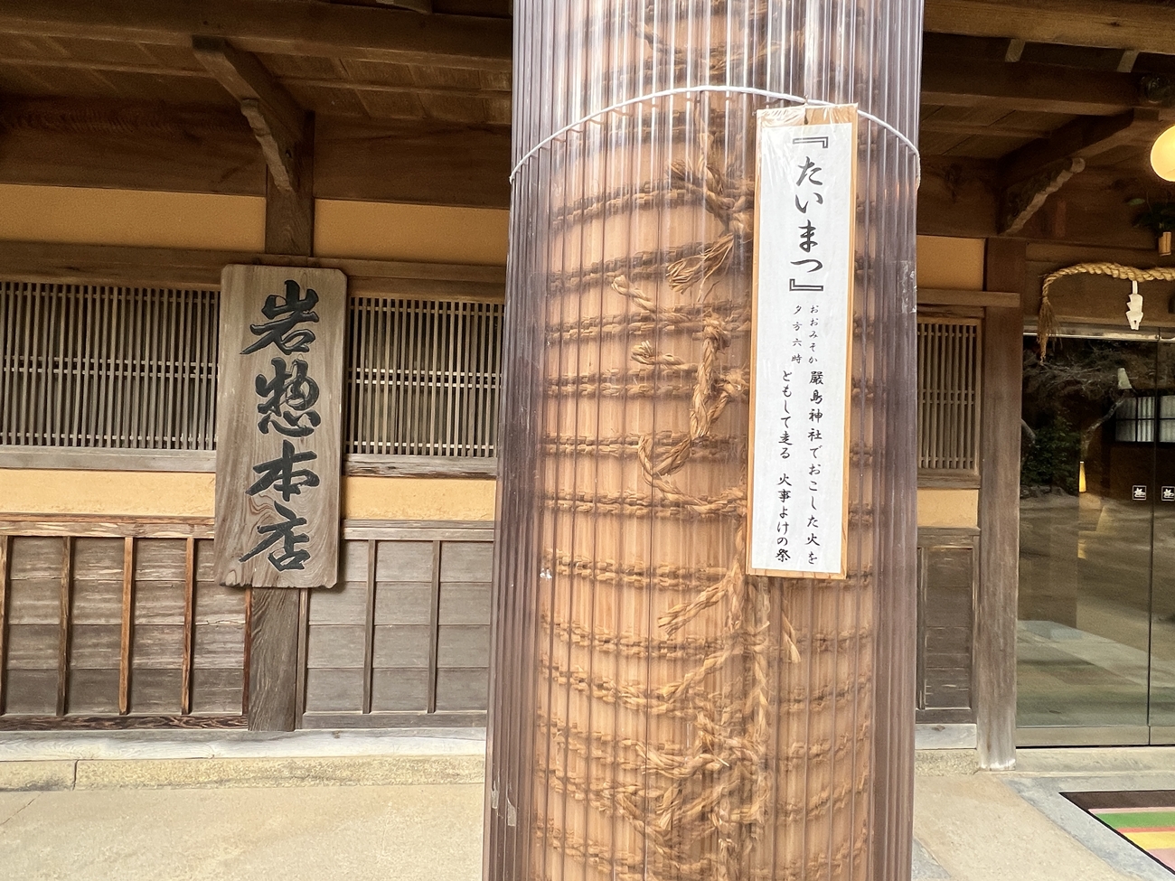 | 宮島彫り、轆轤(ろくろ)細工、ご立派ですね | 宮島踊りのお品でしょうか?とても貴重なモノではと | いつも賑わっている一画。海外からの皆さんにも好評ですよね | 町家通りのP。昨年の鎮火祭で使われたモノでしょうか? | 立派な大松明、底の部分は一体、どうなっているのかと? | かなりの大きさで重量も有りますので、しっかりと藁縄で締め上げられていました |