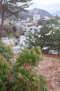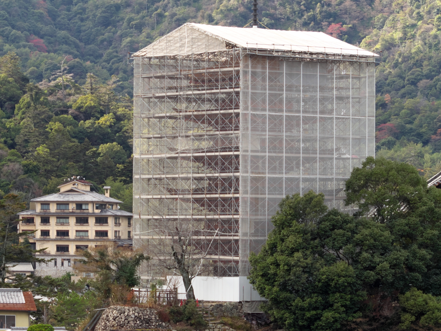| 左向こうに見える砂浜ですが,ドンドン潮が満ちて参りましたですね | 向って左側から大聖院御室派(), 多宝塔(改修中), 聚景荘さまです | 要害山からは大聖院と五重塔とは隣り同士に見えますが,実際にはかなり離れています | |||||