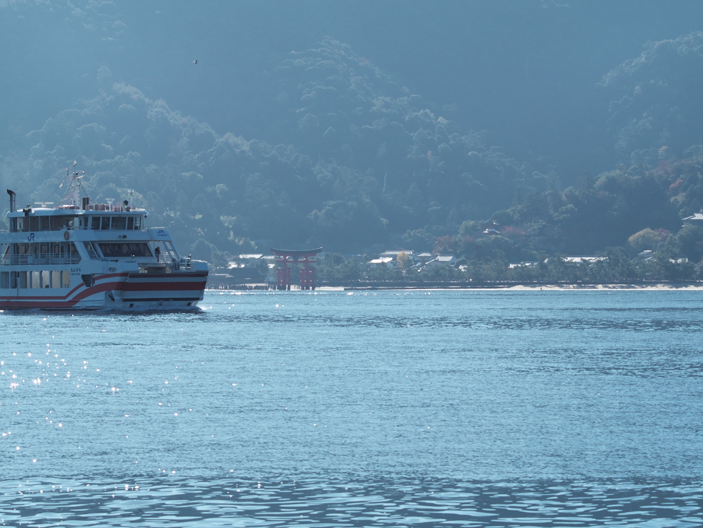| あせび歩道・聚景荘さま前の小径を下ります | 二日目の宮島ですが街中はパスして大鳥居前の砂浜を往復して帰路に着きました | 日曜の朝。宮島から本土へのフェリー, さすがに乗客は数名でした。でもコロナ禍の3年間は週末の昼間の便がこのような惨状でした | 早朝はとても冷たくて, カメラを持つ指がかじかんでしまいましたが、今はもう暖かくなって来ました |