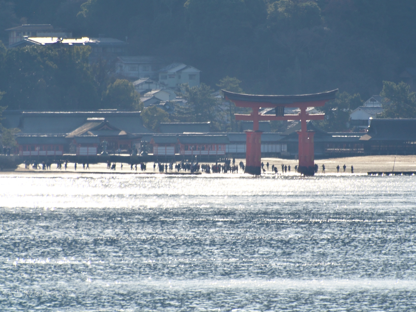 | 肉眼では?でしたが、PCで画像修正をしつつ鴨の一団だと判りました | 西松原です。いつもここからボケ~と海を眺めていた私です | 来島後1時間が経過しましたが、既に大鳥居より沖の側の砂浜は消えてしまい海の底となりました | 厳島神社の人気撮影spotの平舞台, 火焼前ですが未だひと気は無さそうですね | |||