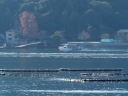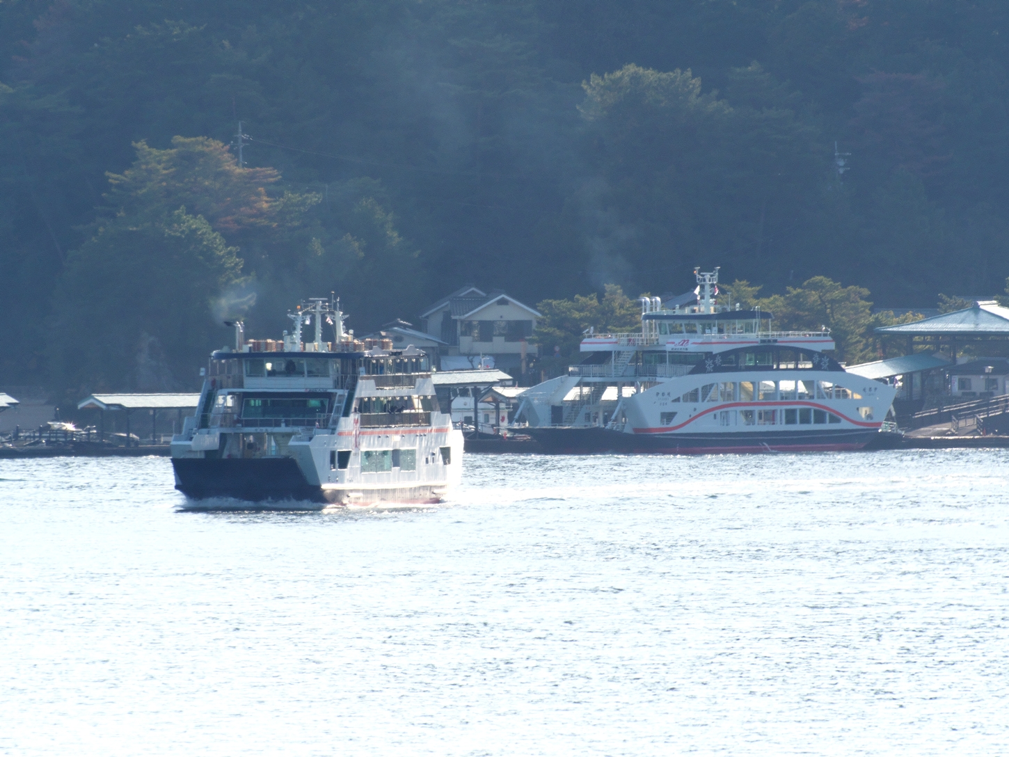 | 帰りのフェリー甲板からの眺め。呉の海上自衛隊の艦船です | 訓練中だったのでしょうか...ビックリする程の急旋回をされました💦 | 瀬戸内海汽船のランチクルーズ船がやって来ました | 広島・宇品港を出港.... 厳島神社前沖で反転後、宮島港に寄港します |