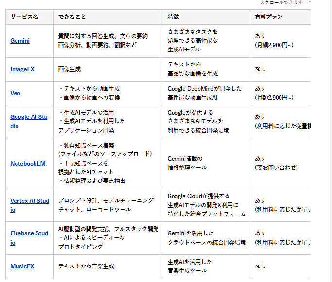 1.最近、流行りのGoogle AIサービスの一覧です。
